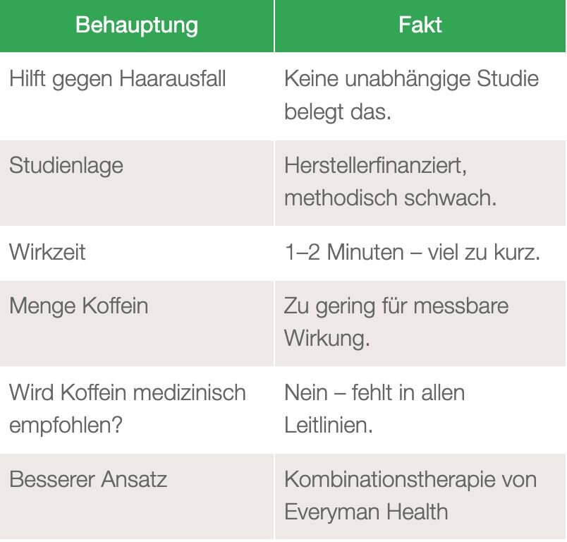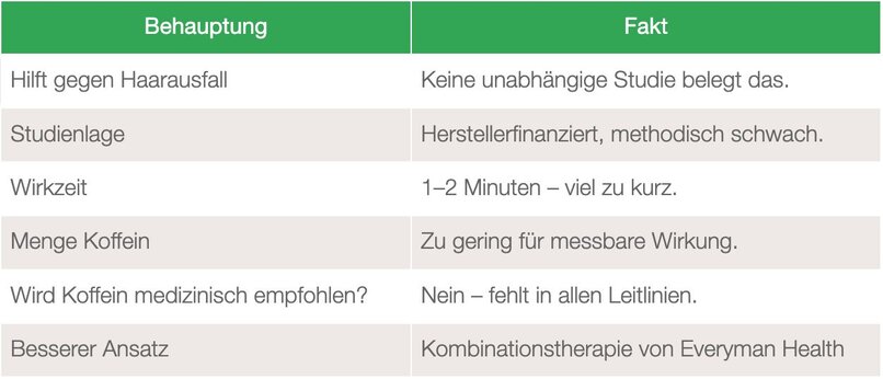 Zwar haben Laborversuche gezeigt, dass Koffein isoliert Haarwurzelzellen stimuliert, unter realen Bedingungen ist die Wirksamkeit jedoch bislang wissenschaftlich nicht nachgewiesen.