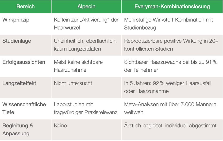 Im Gegensatz zu Alpecin's schwacher Evidenzbasis steht Everymans Kombinationstherapie auf solidem wissenschaftlichen Fundament. So zeigen Studien eine 94 % sichtbare Verbesserung mit der Kombi-Therapie. 80 % der Teilnehmenden zeigten dabei deutlich erhöhtes Haarwachstum.