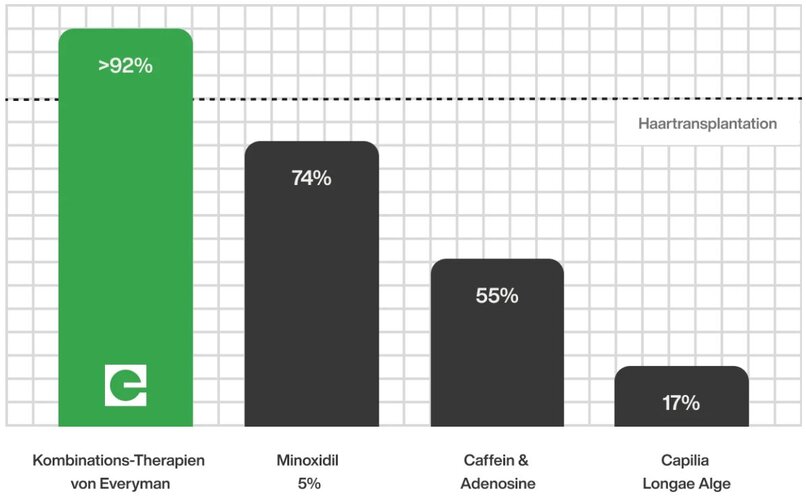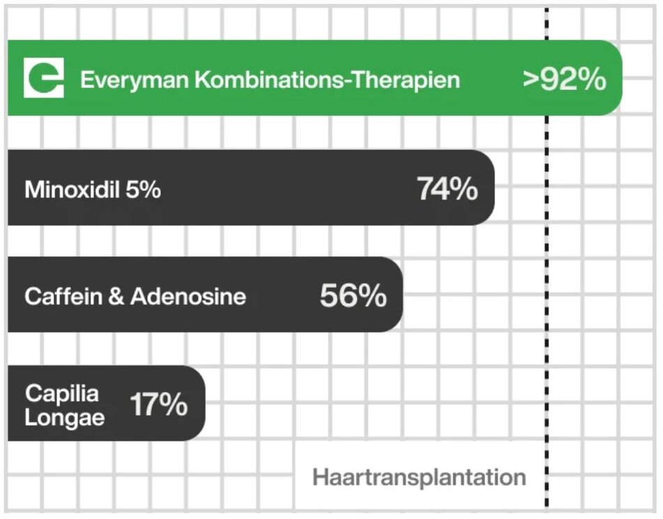 Die Kombinationstherapie von Everyman Health setzt auf Wirkstoffe, deren Nutzen in über 20 kontrollierten Studien mit Tausenden Teilnehmern nachgewiesen wurde. Bereits nach 6 bis 12 Monaten berichten zwischen 60 % und 90 % der Männer von deutlicher Verbesserung der Haardichte. Auch bei einer Langzeituntersuchung über einen Zeitraum von fünf Jahren gelang es 92 Prozent der Männer, den Haarausfall zu stoppen oder wieder mehr Haare wachsen zu lassen.