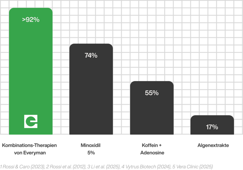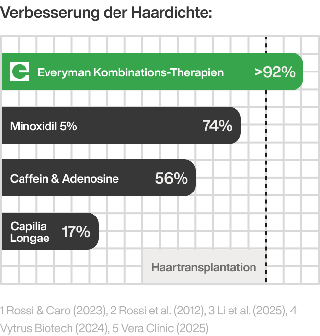 Everyman Health setzt nicht auf einen einzelnen Wirkstoff, sondern auf die Kombination der drei wirksamsten Substanzen gegen genetischen Haarausfall. Dadurch werden gleich mehrere Mechanismen angesprochen: das Hormon DHT wird blockiert, die Follikel wieder besser versorgt, und das Haarwachstum an der Wurzel stimuliert.