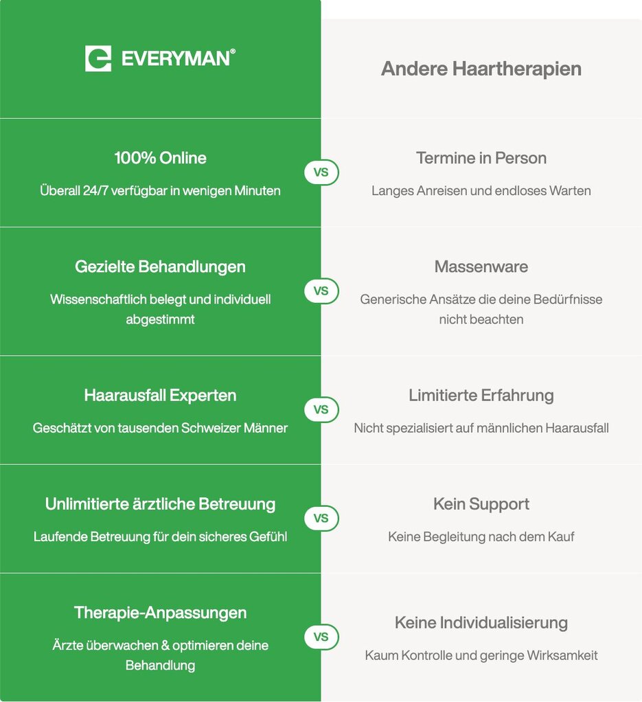 Haarausfall trifft 4 von 5 Männer. Bei frühzeitigem Handeln gibt es jedoch effektive Lösungen. Die Online-Haar-Klinik für Männer Everyman Health bietet personalisierte 3-in-1 Lösungen an. Diese wurden entwickelt mit Schweizer Apotheken liefern wissenschaftlich belegbare Resultate.