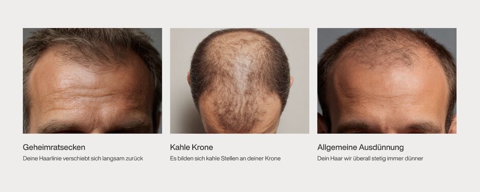 Bei Männern ist Haarausfall oftmals genetisch bedingt. Das Hormon Dihydrotestosteron (DHT), ein Abbauprodukt von Testosteron, verkürzt die Wachstumsphase und verlängert gleichzeitig die Ruhephase der Haarfollikel. Dadurch schrumpfen die Follikel, die Haare werden dünner und fallen schließlich aus.