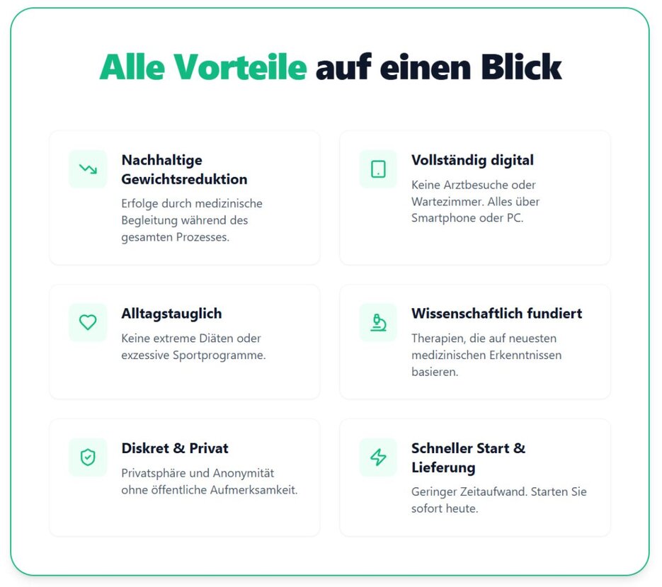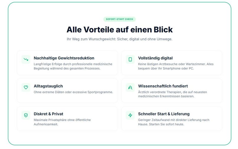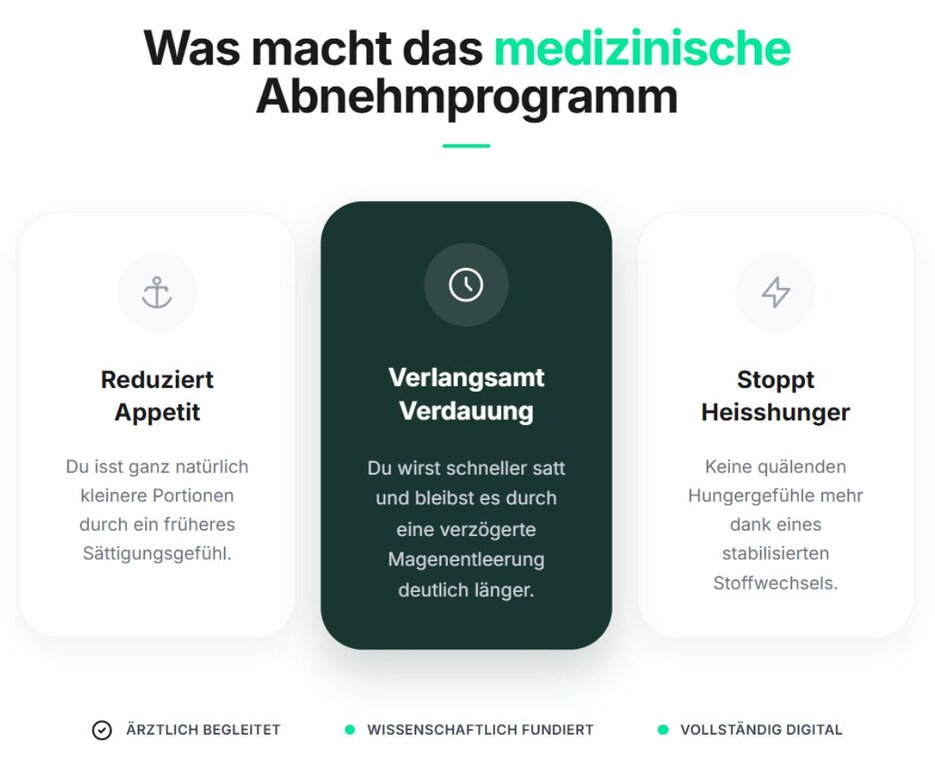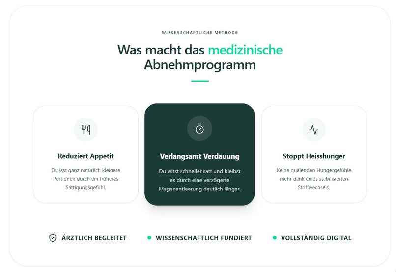 Jetzt gibt es eine medizinische Lösung: Ein digital begleitetes, medizinisches Abnehm-Programm aus der Schweiz. Mit sofortigem Therapiebeginn ohne zeitaufwändige Arzttermine beginnt der erste Schritt jetzt online in nur 3 Minuten.