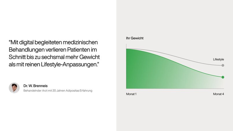 Eine Auswertung des Everyman-Programms in der Schweiz ergab, dass Patienten mit digital unterstützter, ärztlicher Abnehmtherapie im Schnitt bis zu sechsmal mehr Gewicht verlieren als durch Diät- und Lifestyle-Änderungen allein.